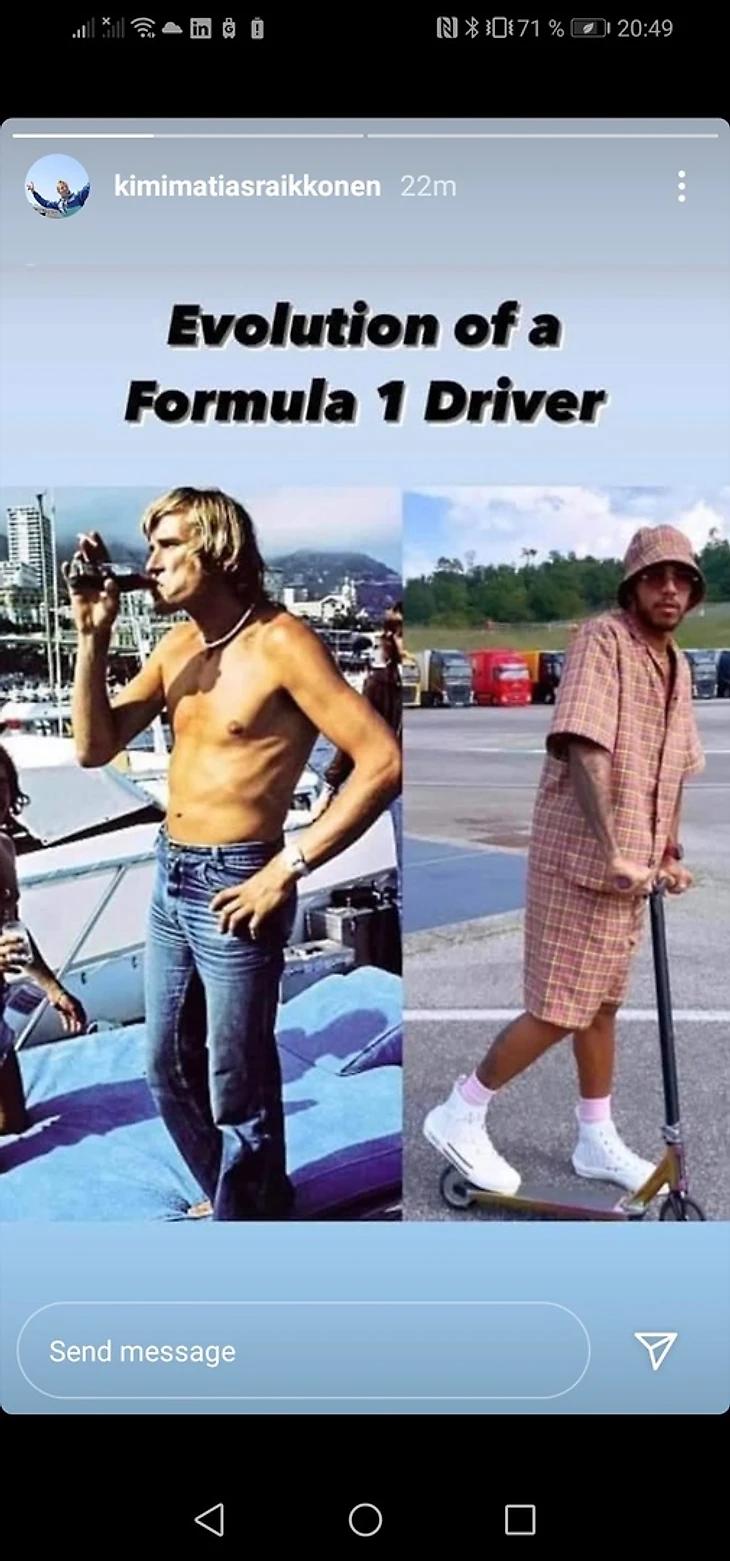 Неописуемая красота прикида шестикратного чемпиона мира впечатлила даже Кими Райкконена – финн запостил в сториз в инстаграме сравнение Льюиса с эпичным победителем «Ф-1» 1976 года Джеймсом Хантом.