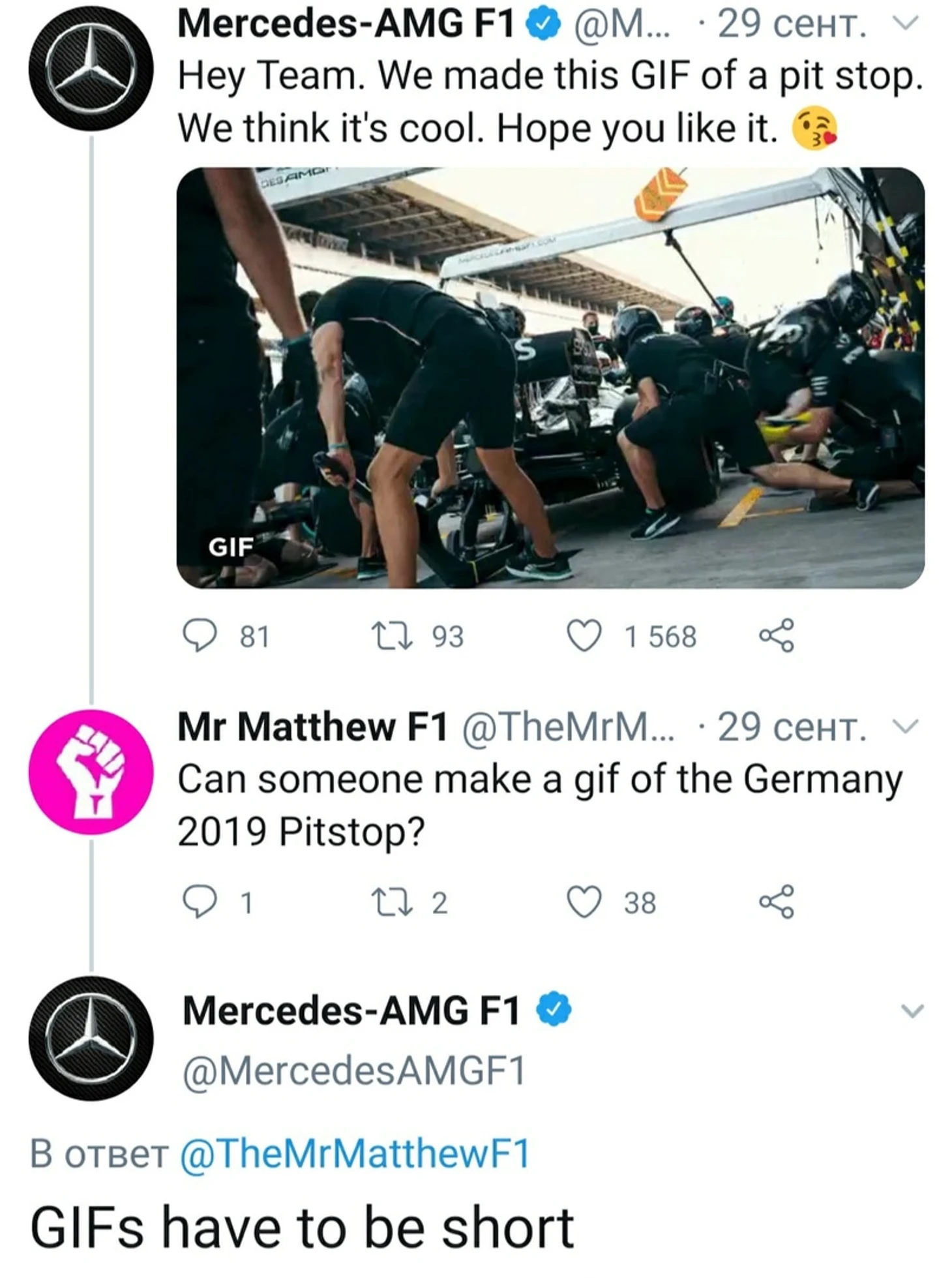 «Мерседес»: Привет, команда. Мы сделали гиф с пит-стопом. Думаем, он крутой. Надеюсь, вам понравится.