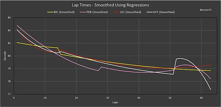 Не верите? Пользователь реддита ProjectF1 составил график покруговок по всей гонке для Риккардо, Квята, Переса и Леклера с учетом регрессии ради поправок на износ шин – чтобы показать динамику чистого темпа каждого претендента на подиум на протяжении всего Гран-при.