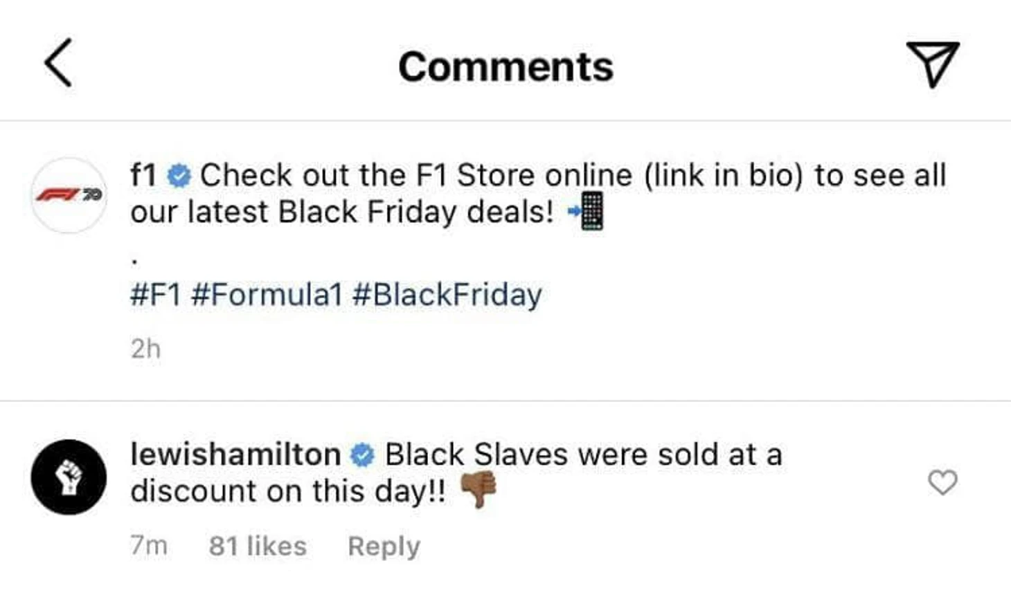«В этот день рабов продавали со скидкой». Теперь Хэмилтон выступил против «Черной пятницы» – вышло очень глупо