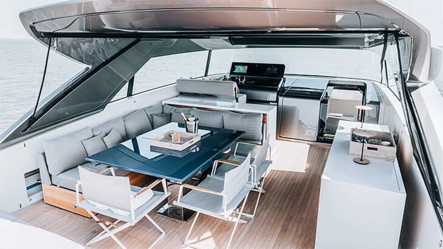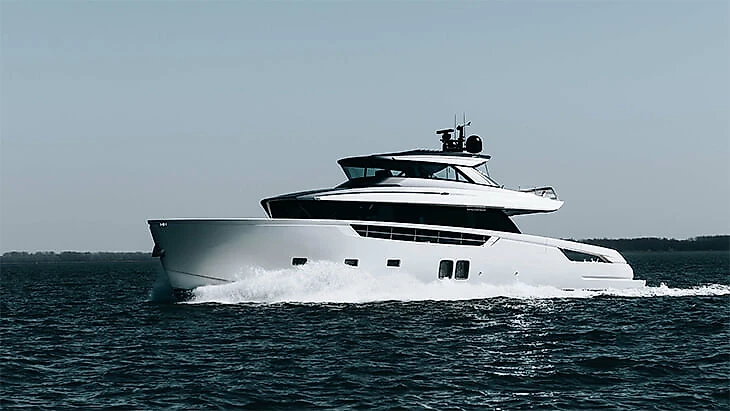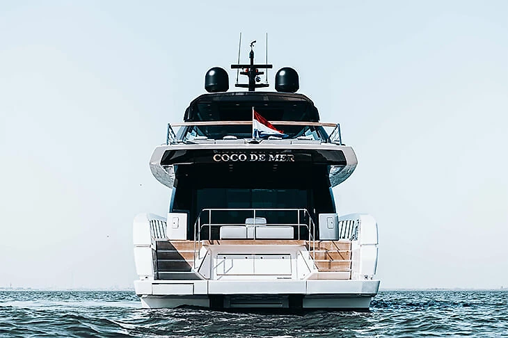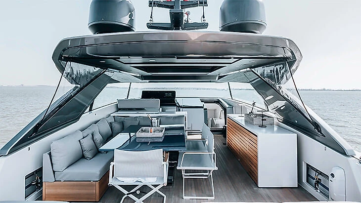 Особенно отличается данная яхта именно скоростью: она способна достигать 22 узлов и плавать по открытому океану. Все благодаря двум моторам «Вольво» Penta S13B на 800 л.с. каждый. Собирают такие с 2018-го на собственной верфи близ городка Специя.