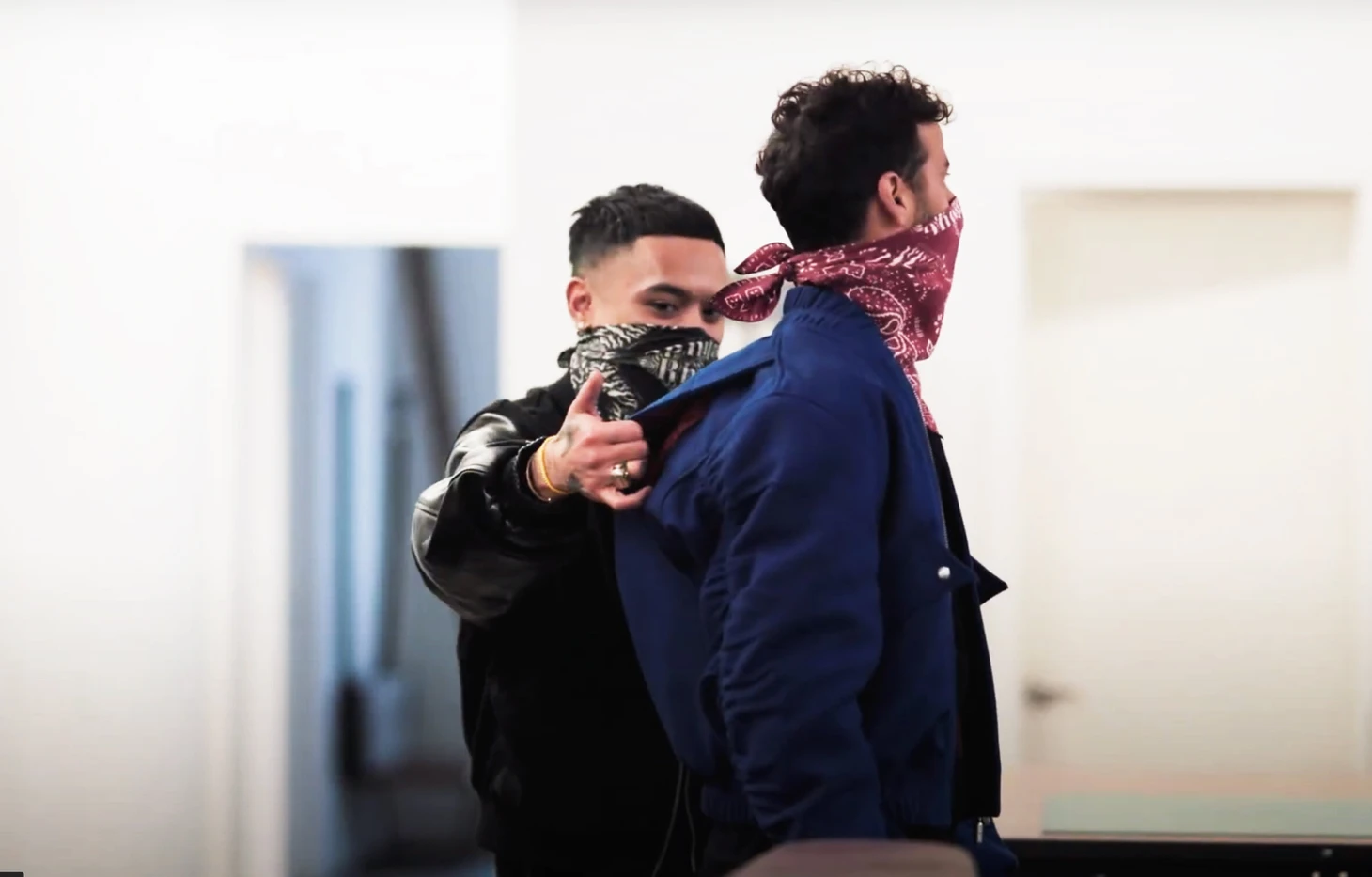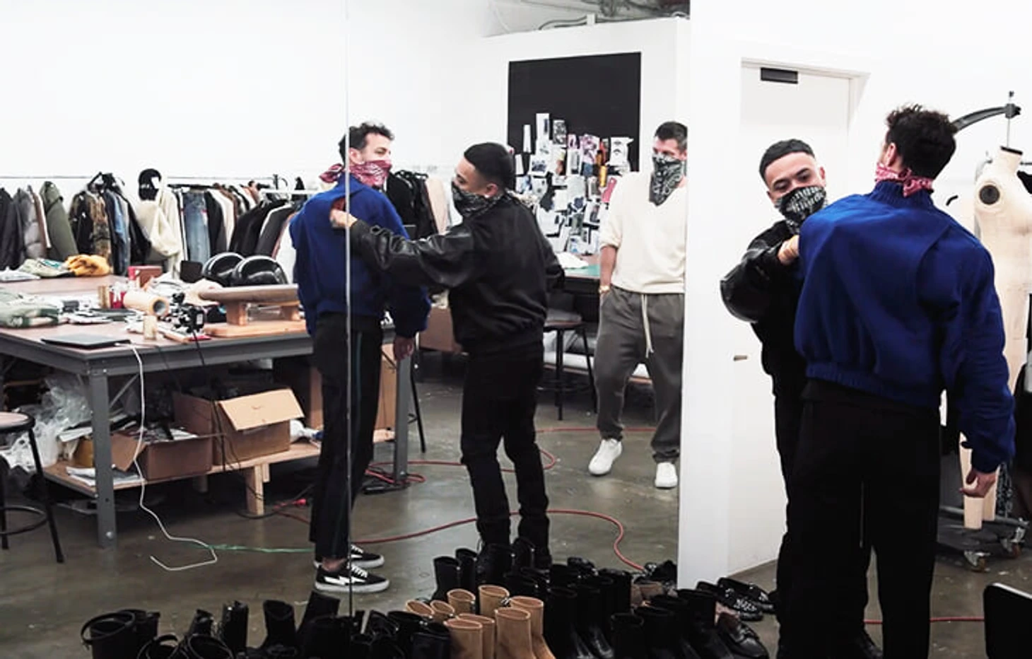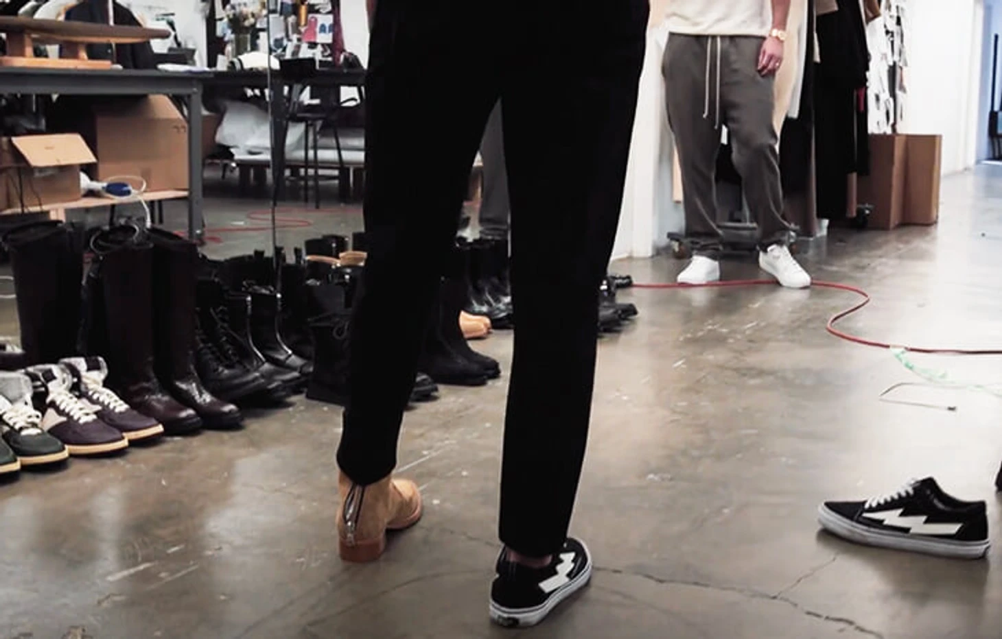 Rhude, конечно, повезло с моделями: Рикк и его напарник Ладно Норрис до того обаятельные парни, что на них все хорошо будет смотреться! А вот с тягой к экспериментами есть проблемы: «Я недостаточно храбрый, чтобы надеть сапоги!», – говорит Даниэль. Риуджи помогает Рикку.