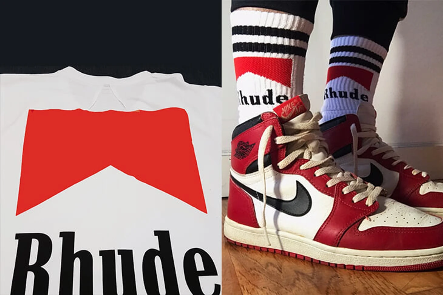 Кстати, еще интересная фишка Rhude – свой логотип он не стесняется маскировать под другие. Вот линейка одежды, которая обыгрывает образ «Мальборо» – ярко-красный на белом фоне. Cумка стоит около 100 тысяч рублей, остальное – распродано.
