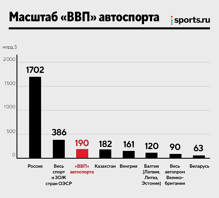 Но даже без вовлечения молодежи автоспорт уже выглядит мегавнушительно – вполне на уровне весьма крупных стран. $190 млрд – это 52-е место в списке номинального ВВП за 2019-й по исследованию МВФ: больше, чем у Казахстана ( у него 182 млрд), Венгрии (161 млрд) и Украины (154 млрд). Все страны Балтии втроем генерируют меньше (Литва – 54,2 млрд, Латвия – 34,1 млрд, Эстония – 31,5 млрд), как и Беларусь (63 млрд). Но до России и ее 11-го места (1702 млрд) автоспорту далеко – как и до прочих гигантов.