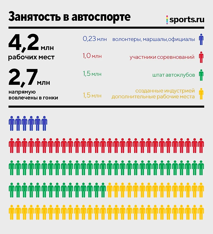 2,7 млн человек – напрямую вовлеченные в гонки: 230 тысяч – волонтеры, маршалы и прочие официальные лица (неоплачиваемые рабочие места), 1 млн – всевозможные участники соревнований, еще 1,5 млн – штат локальных автоклубов, ФИА и прочих объединений