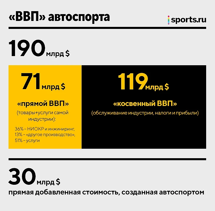 $79,5 млрд из общего «ВВП» – добавленная стоимость, сгенерированная автоспортом и активностями вокруг него. Чистая добавленная стоимость, созданная напрямую индустрией – $30 млрд, остальное – косвенная добавленная стоимость от производства сопутствующих товаров и услуг.