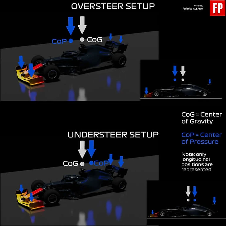 Когда центр аэродинамического давления смещен вперед относительно центра тяжести (то есть на переднем антикрыле и передней части генерируется больше прижимной силы), настройки считаются располагающими к избыточной поворачиваемости. Когда центр давлений позади центра тяжести – тогда речь идет о недостаточной поворачиваемости. Цель инженеров – как можно лучше совместить эти две точки, чтобы предоставить пилоту максимально сбалансированную машину.