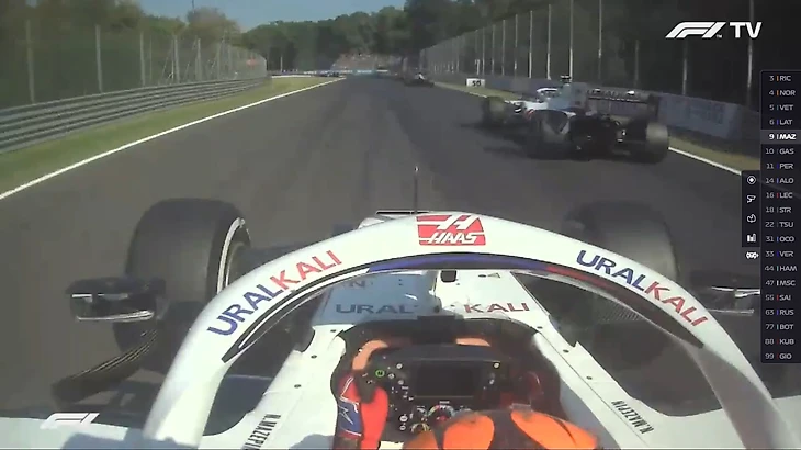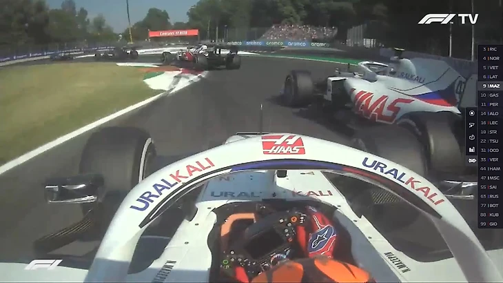 Мазепин неплохо разогнался на прямой по пути к шикане «Де ла Роджа» (связка 4-5 поворотов), увидел возможность для вполне обычной для Монцы атаки за счет более позднего торможения и выбирал внутреннюю траекторию.