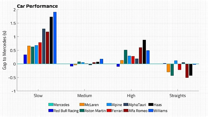 (Первый график – отрывы всех команд от «Мерседеса» в медленных поворотах, второй – в среднескоростных, третий – в быстрых, четвертый – на прямых).