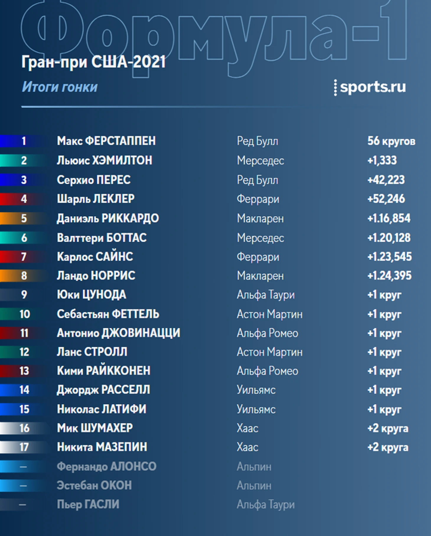 На финише Карлосу не удалось сохранить и шестую позицию – его настиг Валттери Боттас на чемпионском «Мерседесе». Риккардо все же удержался в топ-5, Леклер закончил четвертым, Норрис – восьмым.