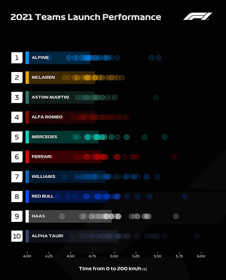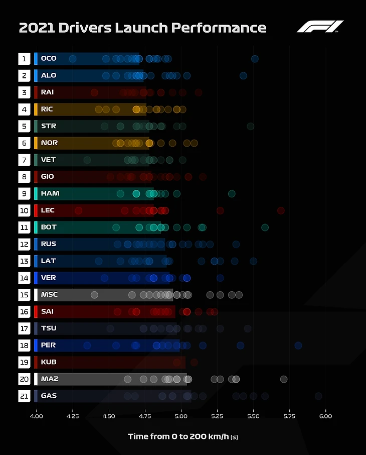 (на график попали только разгоны быстрее 6 секунд, длина полосок – медиана (то есть половина достижения 200 км/ч проходила быстрее, половина – медленнее), точки – как раз показатели разных Гран-при).