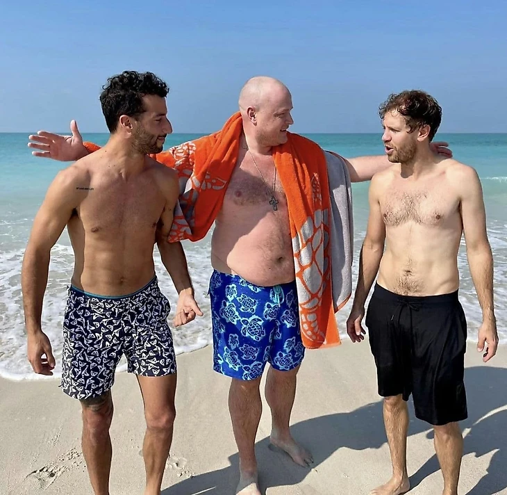 А это Себастьян Феттель сразу после финального Гран-при сезона – на пляже вместе с одним из британских журналистов. Сравните его форму относительно мощного и поджарого Даниэля Риккардо слева.