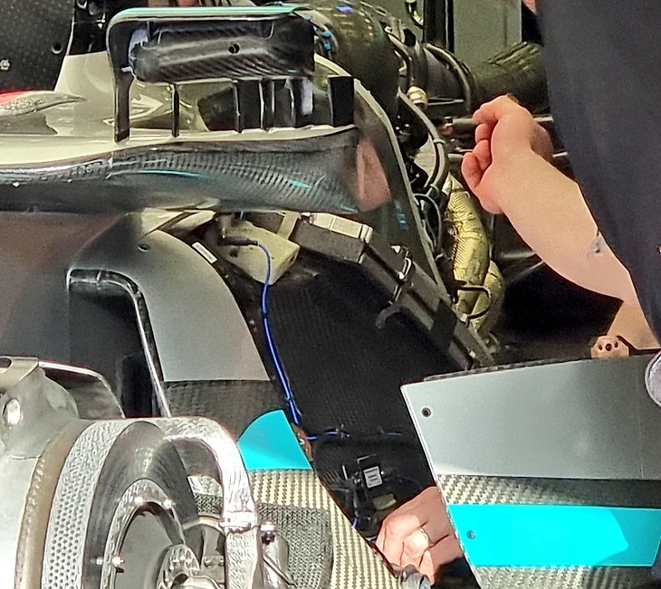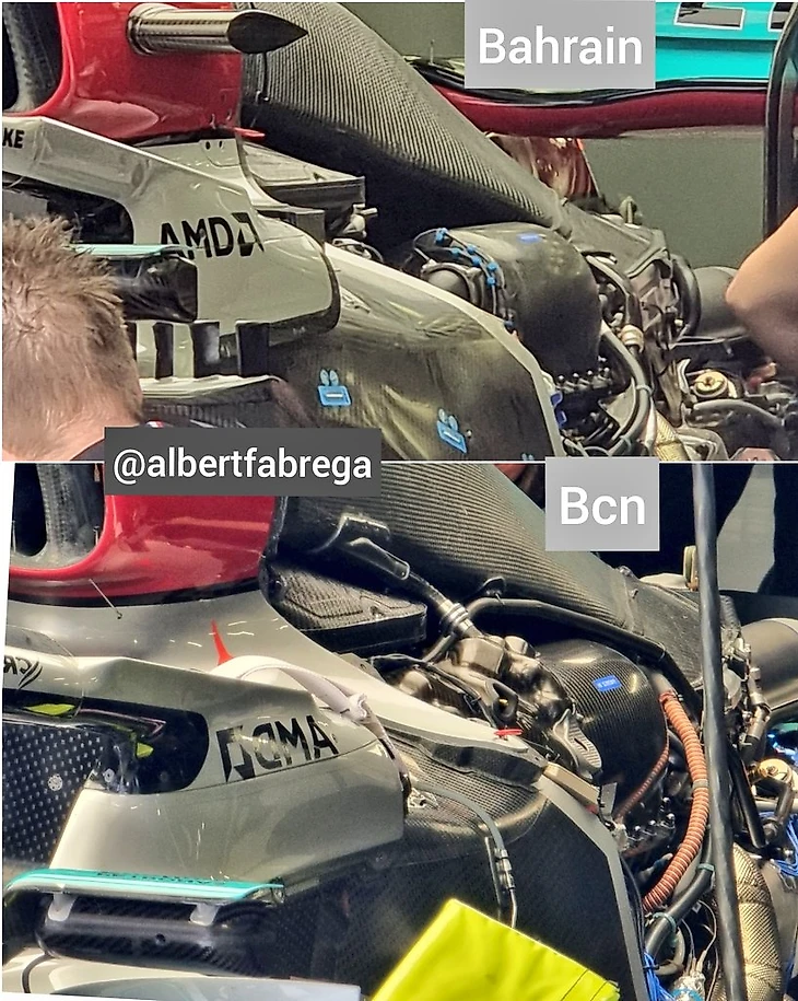 И судя по сравнению компоновки внутренностей W13 с тестов в Барселоне и обкатки в Бахрейне, детали под корпусом в самом деле не поменялись – только немного сдвинулись с учетом уплотнения компоновки: