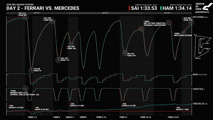 Отставание в конце прямых слишком велико: немецкая команда, очевидно, не использовала агрессивные настройки. Есть, конечно, и другой вариант: «Феррари» правда построила космический корабль, а «Мерседес» просто не может выдавать столько же гибридной электрической энергии к концам прямых. Теоретически, конечно, это возможно, но тогда соперники Скудерии (и Тото Вольфф в первых рядах) насели бы на прессу с рассказами в стиле «все пропало» – нет, сейчас все тоже изо всех сил снимают с себя рубашки фаворитов, но про недостаток мощности не говорит никто.