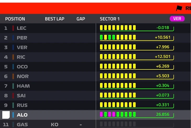 Сам двукратный чемпион тоже в блестящей форме – и во время квалификации на Гран-при Австралии он вновь ее продемонстрировал. Посмотрите на мини-сектора первой половины третьего сегмента – после первых попыток Алонсо взял абсолютно лучший первый сектор и показал времена быстрее Леклера и Ферстаппена: