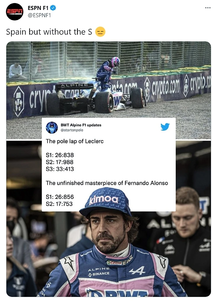 «Не уверен, что «Альпин» точно боролась за поул, но у меня определенно был шанс на топ-3, – поделился разочарованный испанец после финиша квалификации. – Думаю, один только этот круг был достаточно хорош для топ-3, и у нас еще оставалось два комплекта свежих шин [чтобы попытаться снова]. Возможно, лучший мой уик-энд за годы вместе с битвой за поул».