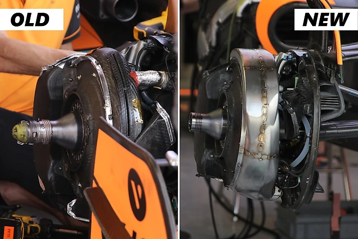 Изменилась форма конструкции, а сильно облегченная и экспериментальная карбоновая версия корпуса сменилась на более традиционную металлическую. Детали потребовалось больше пространства для более эффективного теплообмена с воздухом – уменьшение площади ради сокращения массы явно не сработало, да и углепластик оказался более хрупким на высоких температурах по сравнению с быстрее остывающим металлом. «Макларен» пожертвовал лишним килограммом массы и потерей 0,03-0,04 секунды с круга – но финиш Норриса в топ-10 доказал верное направление адаптации к проблеме.