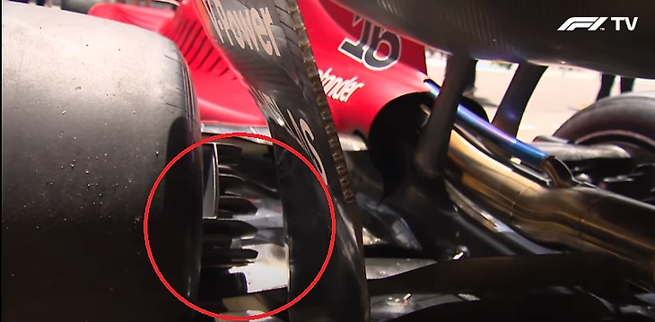 Теперь прямо следом за «вырезом» в днище идет отводящий воздуховод – он убирает воздух в момент максимального «присасывания» машины к асфальту и не дает проявляться эффекту галопирования. Причем его еще и включили в систему «обтекания» задней шины для уменьшения турбулентного потока от них – такие мелкие улучшения должны немного подтянуть общую эффективность шасси F1-75 к эталону «Ред Булл» (RB18 на первом Гран-при выигрывала почти 5% – колоссально много для «Ф-1»).