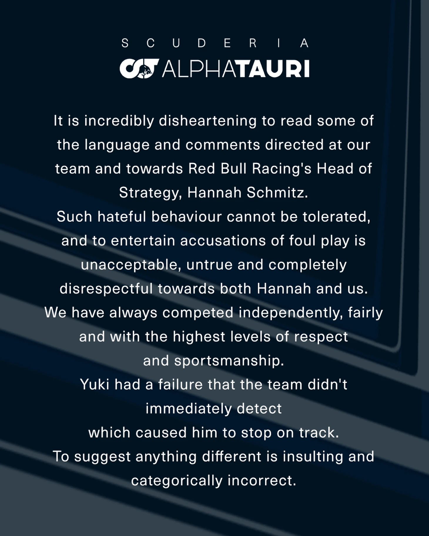 Мы всегда выступали честно, независимо и с высочайшим уровнем уважения и спортивного поведения. У Юки Цуноды случилась поломка, которую команда обнаружила не сразу – из-за этого он и остановился на трассе. Предполагать что-либо иное – это оскорбительно и категорически некорректно».