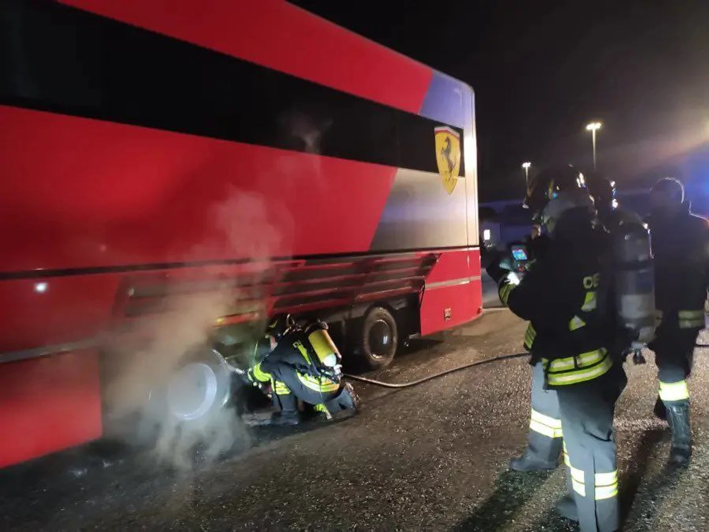 Гран-при Италии еще не стартовал, а у «Феррари» уже поломка: загорелся грузовик с моторами. Спасали пожарные