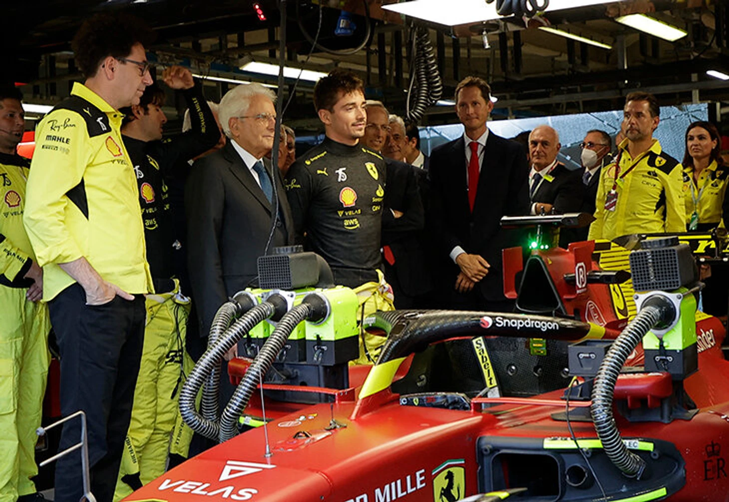 Городок под Миланом стал точкой притяжения самых разных знаменитостей. Например, поболеть за итальянскую команду в честь праздника приехал сам президент Италии! Вот он, с шефом Скудерии Маттией Бинотто, Шарлем Леклером, также CEO и главного владельца «Феррари» (и концерна Stellantis) Джоном Элканном.