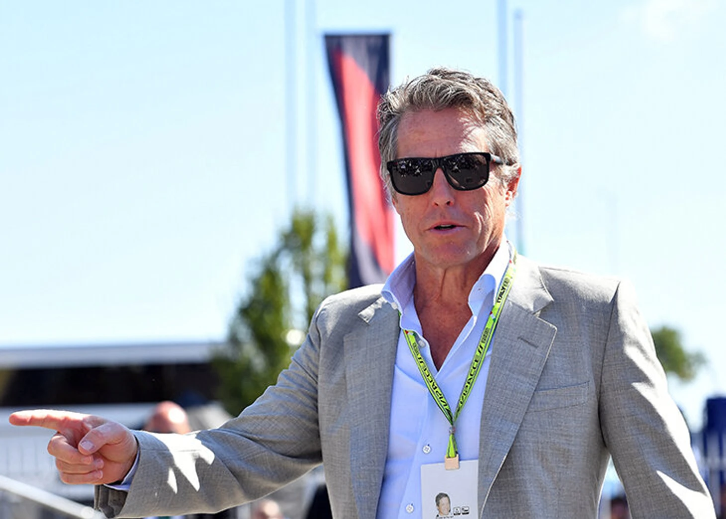 Американский актер Хью Грант торопится в боксы «Феррари» перед гонкой.
