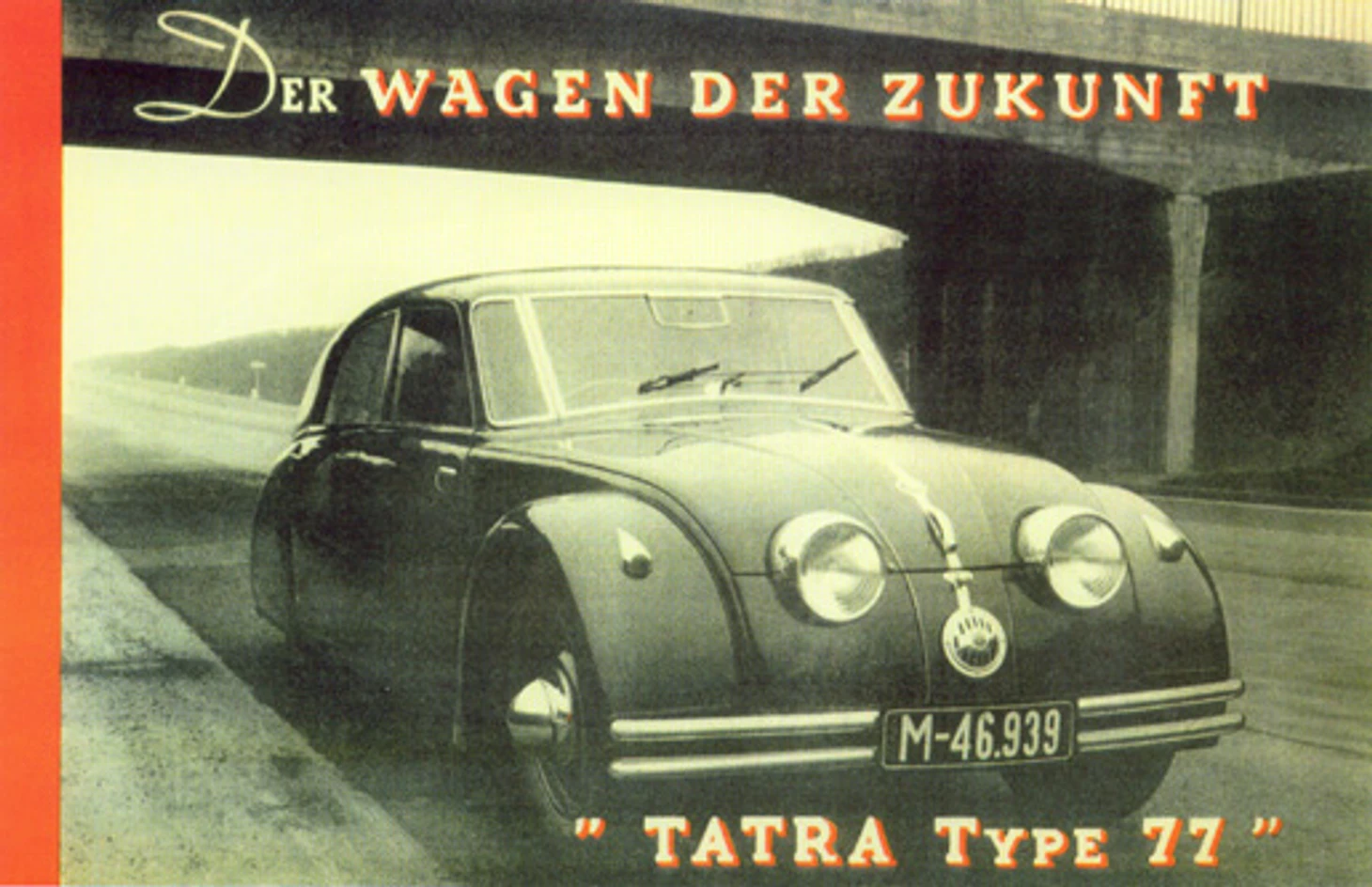 Что это? Реклама запущенной в 1934-м машины «Татра» 77 – одного из первых в истории авто-«стримлайнеров» с аэродинамичной формой. Она стала главной фишкой: работа над формами кузова позволили достичь невероятно низкого коэффициента лобового сопротивления в 0,212 у прототипа.