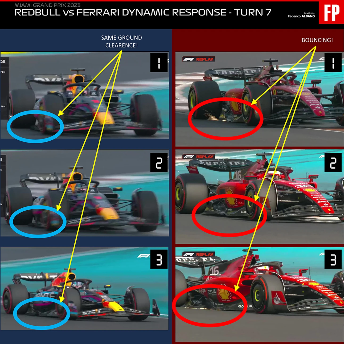 В итоге алая машина крепко вдарилась днищем, случился перебой с прижимной силой в задней части – и разворот как последствие (здесь сравнение с Ферстаппеном, который тоже сильно рисковал, но чуть меньше).