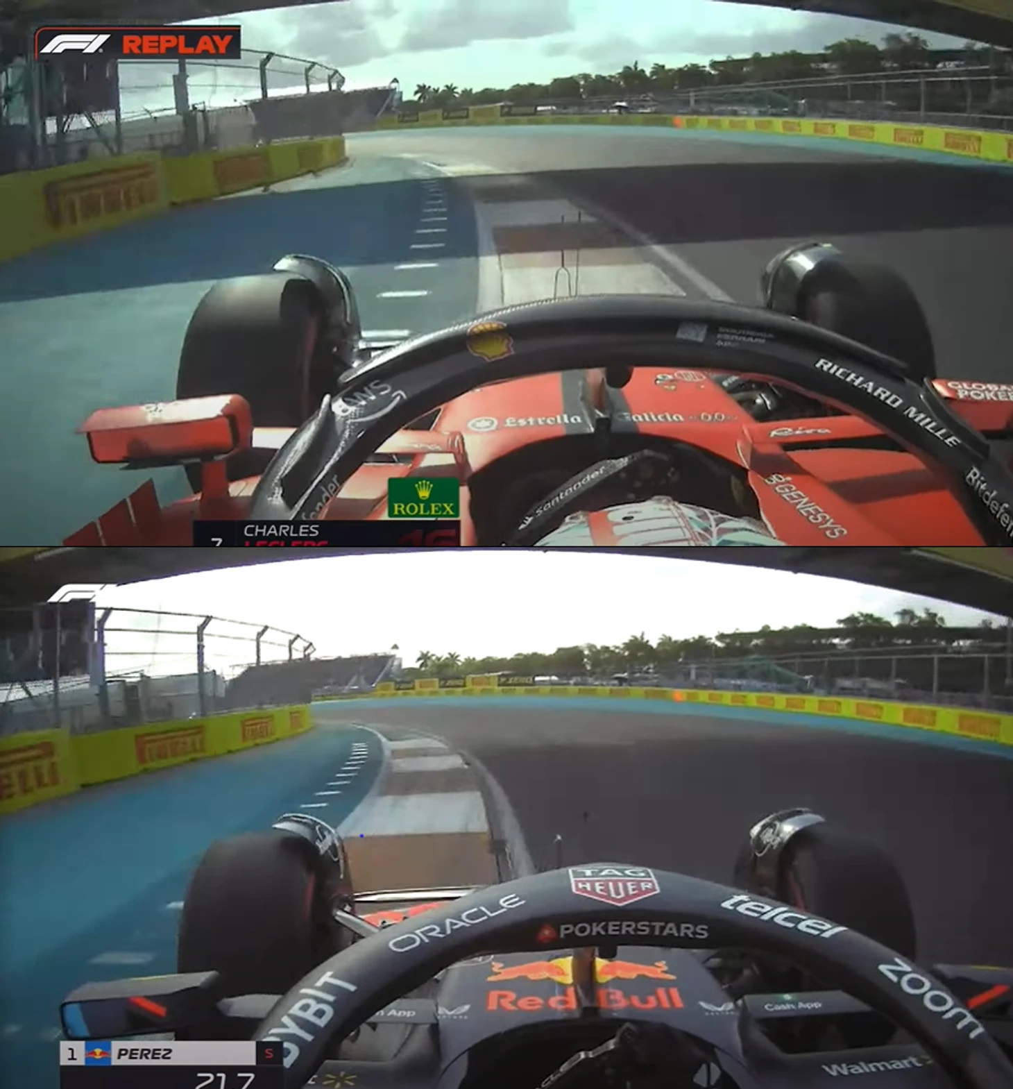 Насколько же Леклер дополнительно рисковал? Вот один из поворотов незадолго до вылета относительно траектории обладателя поула Переса – Шарль просто сожрал поребрик, а на высоких скоростях он сильно дестабилизирует болид вибрациями и перепадами сцепления между разными покрытиями. Вероятность разворота от такого всегда крайне велика, если шины недостаточно прогреты и с настройками (или самой машиной) хоть что-то не так.