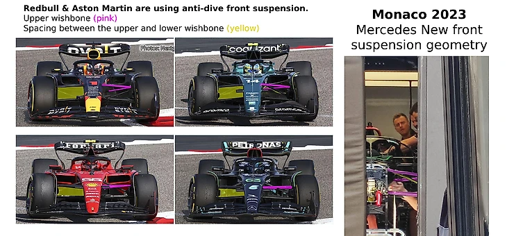 «Мерседес» привез в Монако еще одну новую подвеску. Новый «Мерседес» – справа, и он принял то же направление расположения верхних пилонов (розовые) и пространства между верхними и нижними пилонами. Раньше детали W14 больше походили на «Феррари». По оценкам технического аналитика официального сайта «Ф-1» Марка Хьюза, разница крайне значительная: у «Ред Булл» угол крепления ведущего пилона – примерно 45 градусов, а у старой версии «Мерседеса» было около 15 градусов.