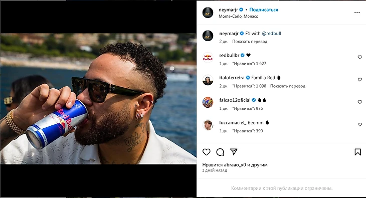 Причем именно «Ред Булл» – спонсор его поездки: даже по инстаграму Неймара это отчетливо видно:
