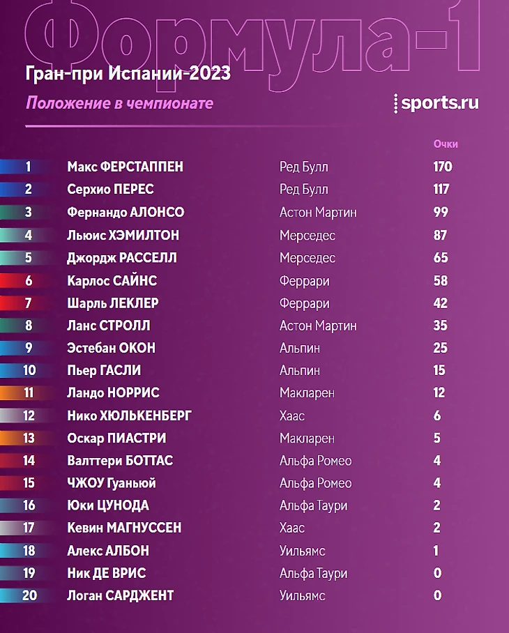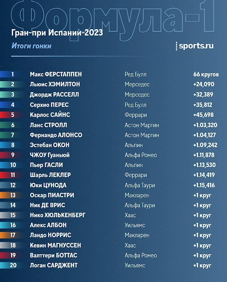 – Ферстаппен удержал лучший круг и собрал третий Большой шлем в карьере – с преимуществом в 23 секунды над «Мерседесами»! Хэмилтон и Расселл на подиуме, а Перес с Сайнсом – все-таки позади: