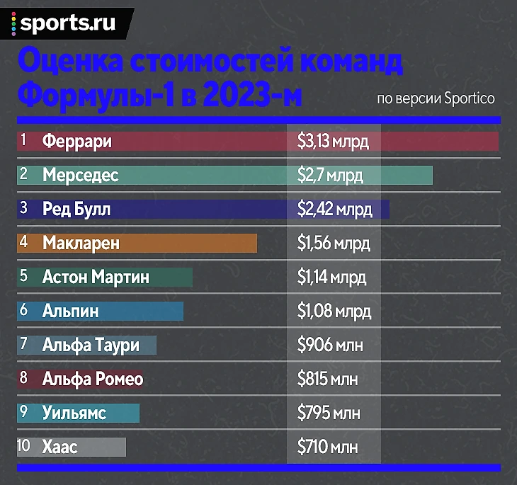 Суммарная оценочная стоимость всех команд – $15,3 млрд. Для сравнения: головная компания всей серии «Ф-1» сейчас торгуется по оценке в 30 млрд, а ее шеф Грег Маффей заявлял, что хотел бы получить при возможной продаже серии выручить намного больше 20 млрд.