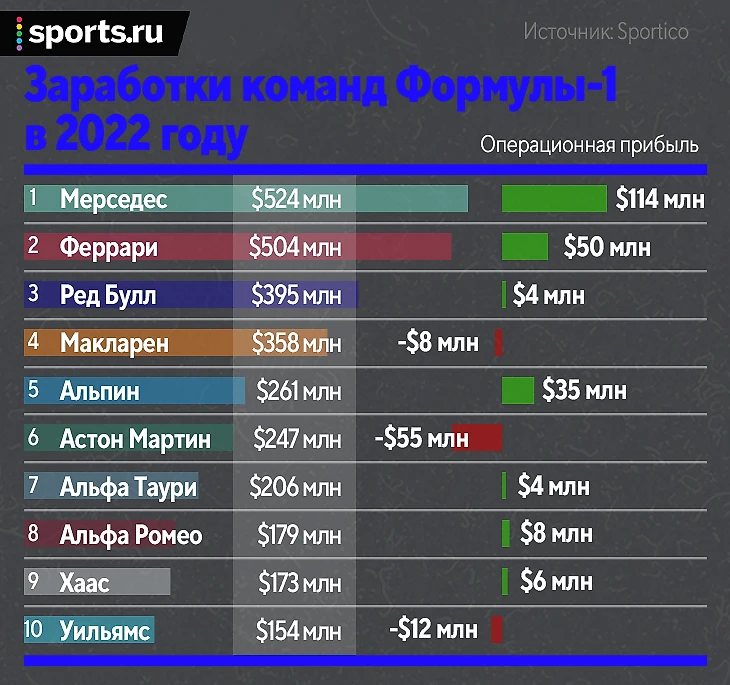 К середине 2023-го все участники «Ф-1» подали финансовые отчеты за предыдущий сезон в налоговые своих стран, а специалисты Sportico (из медиаимперии Penske Media Corp – у них в портфолио издания Variety и Rolling Stone, в штате финансовые спецы из Wall Street Journal) изучили бухгалтерию и собрали выручки всех команд вместе с операционными прибылями в один рейтинг (больше половины команд подтвердили или предоставили данные).