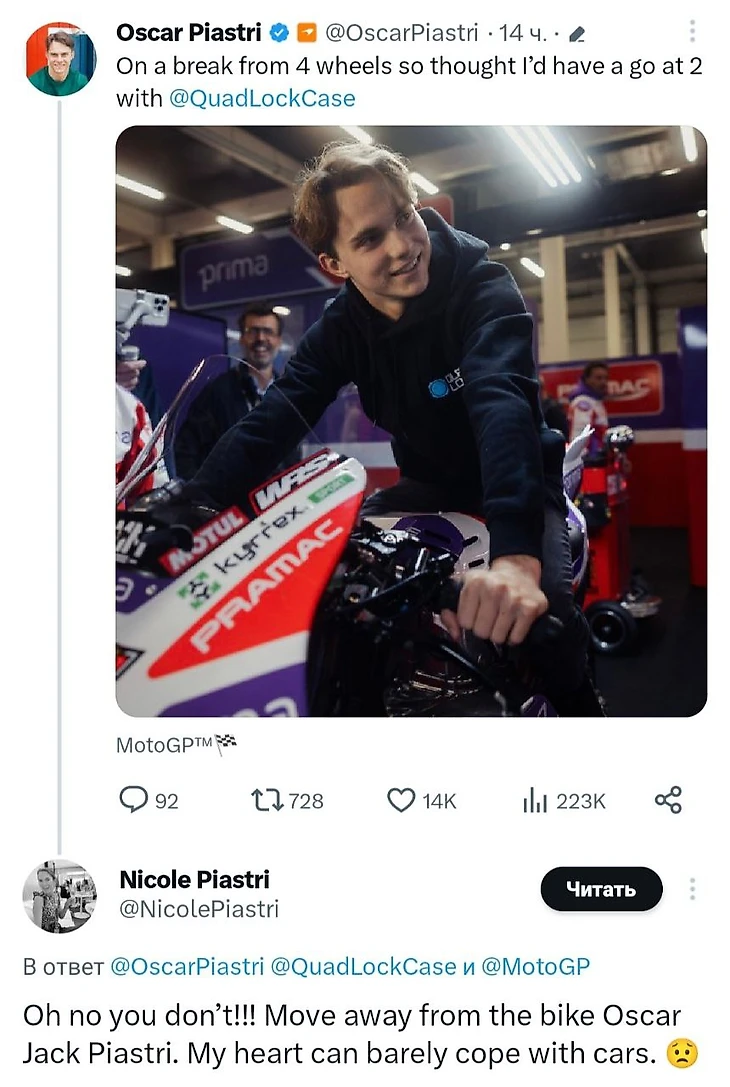 В летний перерыв Оскар Пиастри вместе с напарником Ландо Норрисом заглянул на этап чемпионата мира по мотогонкам в Великобритании на «Сильверстоуне»: