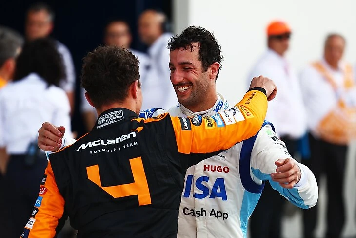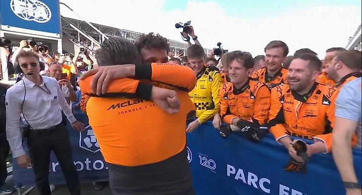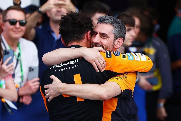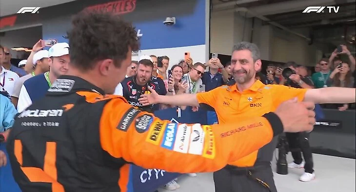 Конечно же, боссы команды не могли не поздравить свою звезду: сначала Ландо ждали крепкие объятия от исполнительного директора Зака Брауна: