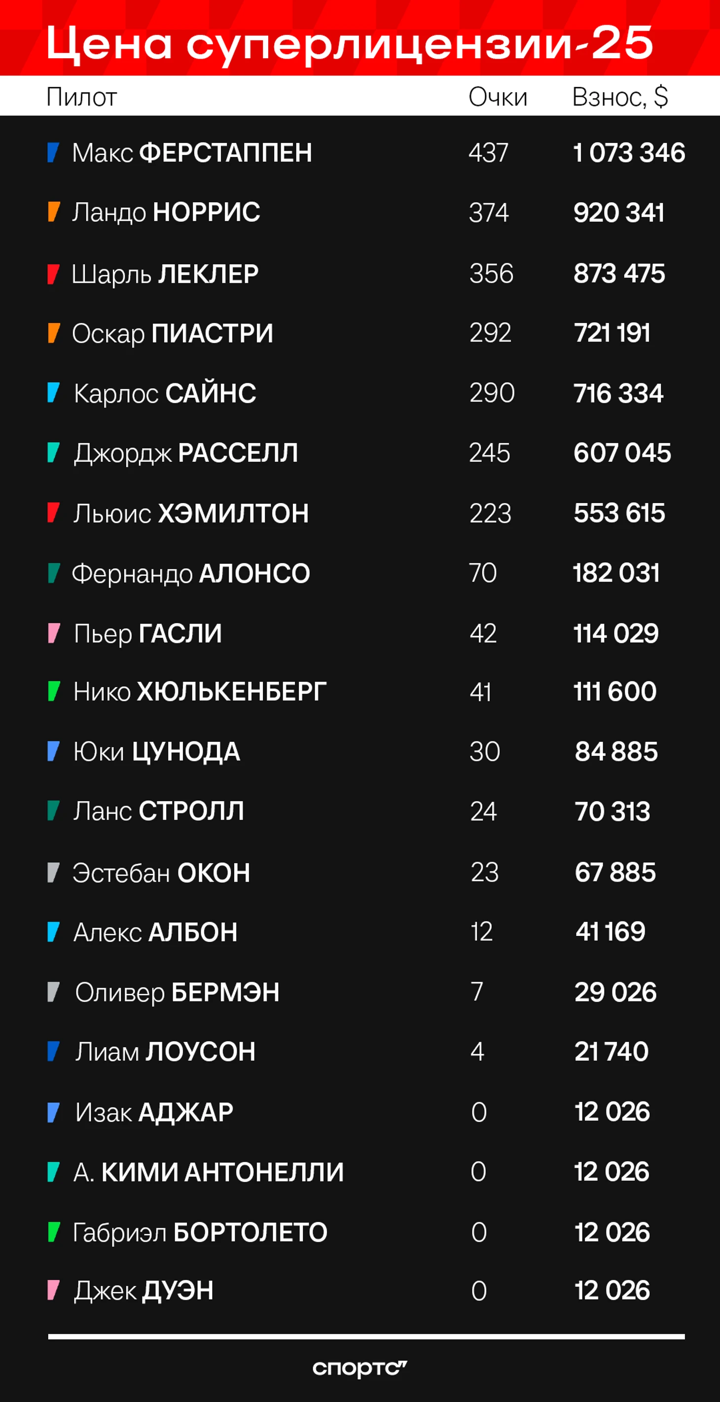 Дело в индексации: базовая плата за суперлицензию в 2025-м подорожает примерно на 1000 долларов и достигнет $11 900, плюс $2 400 придется заплатить за каждый заработанный в прошлом сезоне балл (лишь на $210 выше прошлогодней цены).
