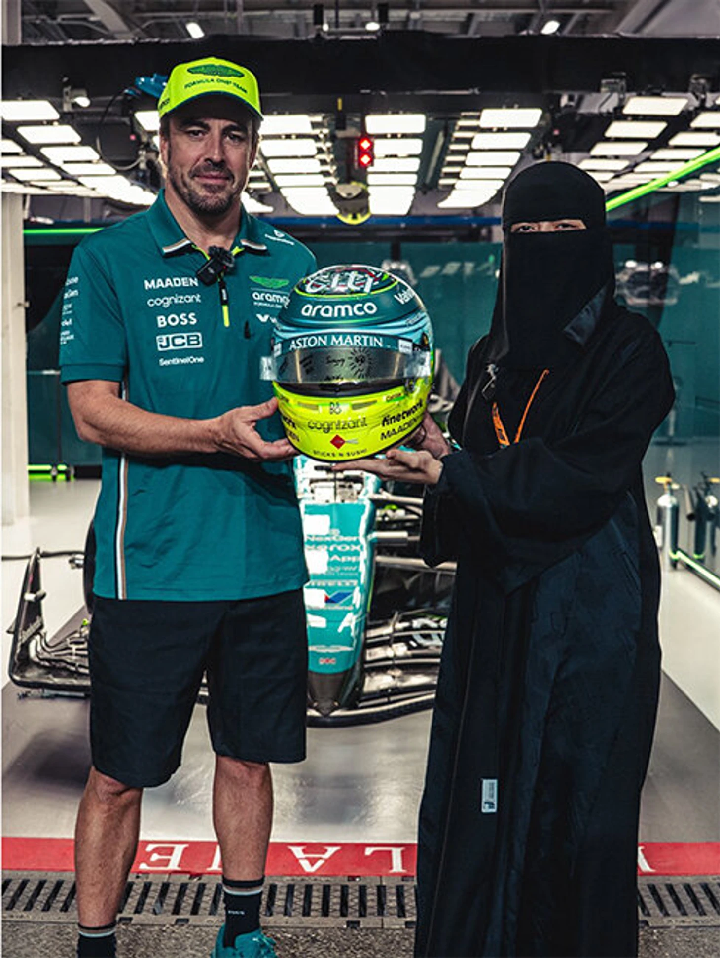 Правда, иногда арабский колорит рядом с «Формулой-1» выглядит совершенно инопланетным. Например, Фернандо Алонсо доверил дизайн шлема общенациональному творческому конкурсу одного из спонсоров и акционеров «Астон Мартин» Aramco – его выиграла художника Сара Туркестани, и презентация выглядела вот так.