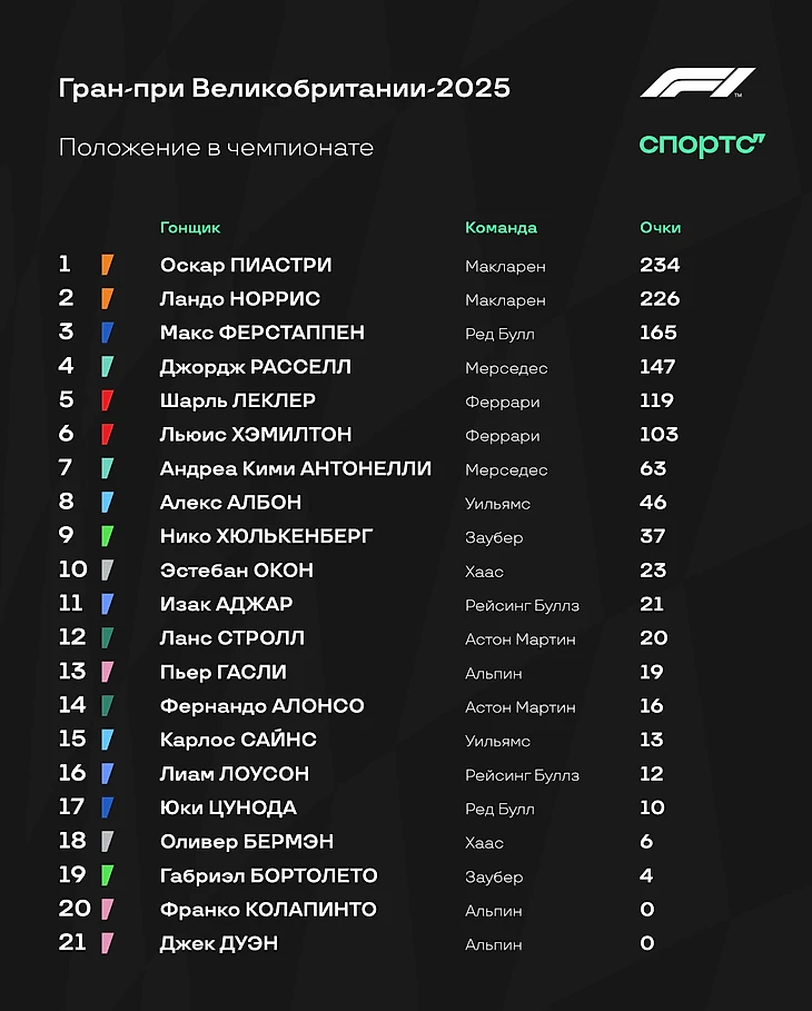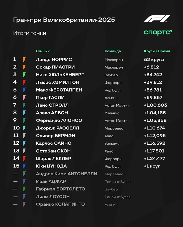 Пиастри же получил 10 секунд штрафа за оттормаживание Ферстаппена. Антонелли сняли с гонки. Цунода тоже получил 10 секунд штрафа за вынос Бермэна.