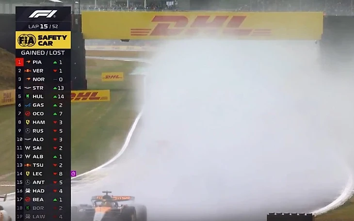 Благодаря очередности пит-стопов и отыгрыша времени и позиций на сликах Стролл взлетел на 4-е, Хюлькенберг поднялся на 5-е, за ними – Окон и Гасли. А Хэмилтон на 13-м круге передал: «условия – для дождевых шин». Включили режим автомобиля безопасности.