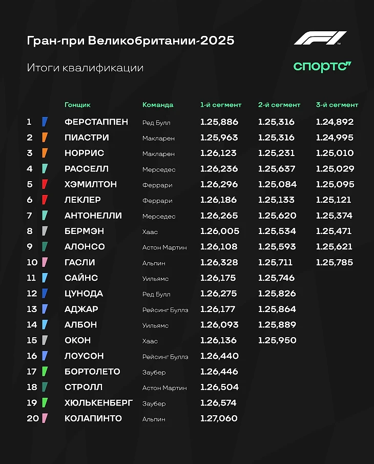 Стартовый порядок изменился уже после клетчатого флага квалификации: ведь Антонелли получил 3 позиции за крэш с Ферстаппеном в Австрии, а Бермэна наградили десятью штрафными местами за аварию на пит-лейн в режиме красных флагов. Колапинто же вновь сменили мотор после аварии в квалификации и последнего места – чтобы не пришлось отбывать наказание на последующих Гран-при. Аргентинец попал на пит-лейн.