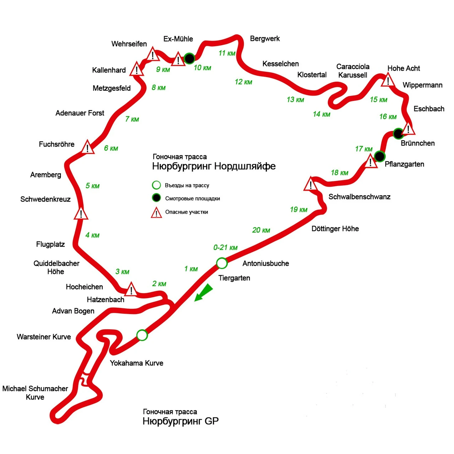Первоначально автодром состоял из четырёх «колец» — Объединённая петля длиной 28,265 км, которая в свою очередь состояла из 22,810-километровой Nordschleife, которая известна как Северная петля, и 7,747-километровой Südschleifе, на котором в последствии и проводили Гран-При Формулы 1 начиная с 1984 года.