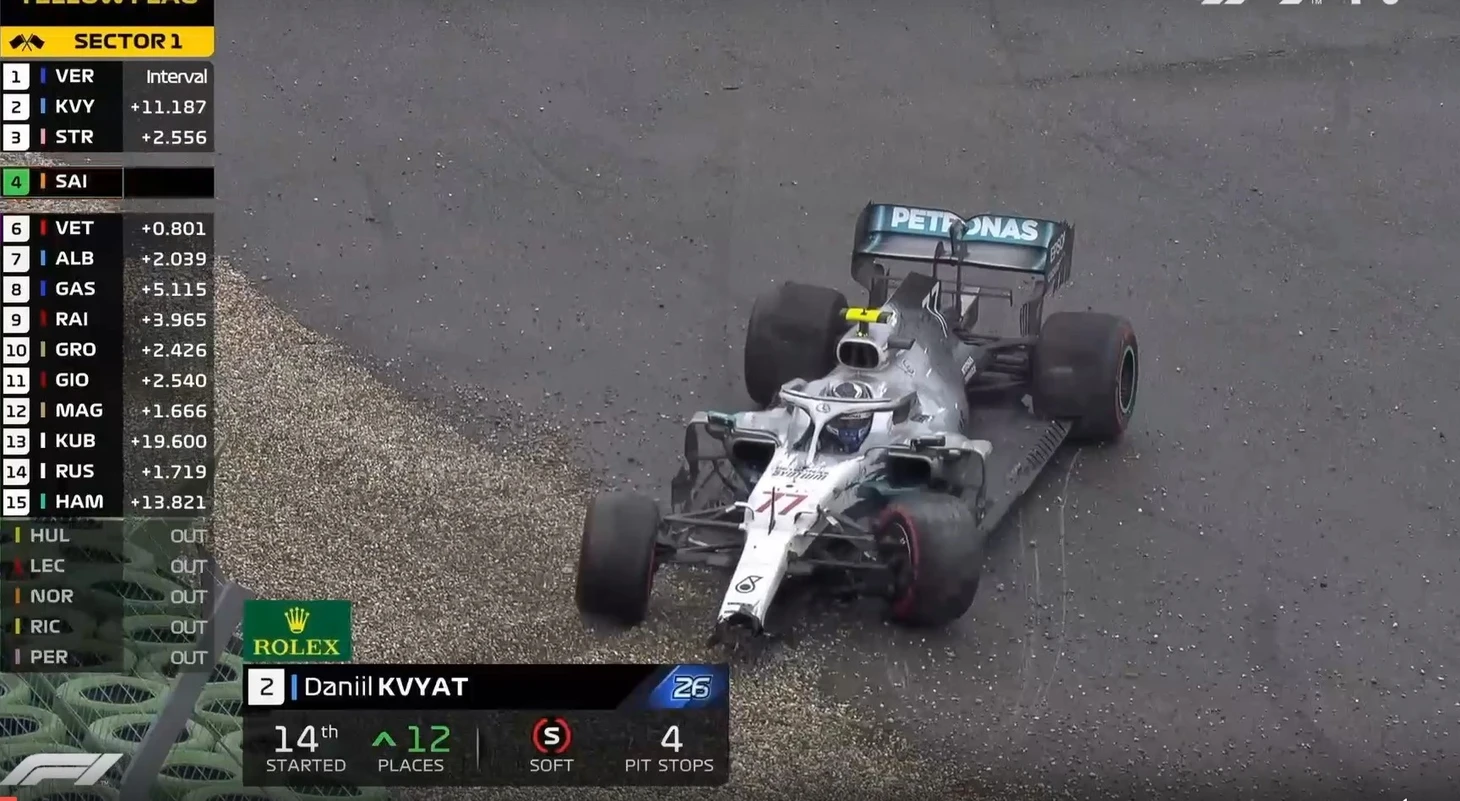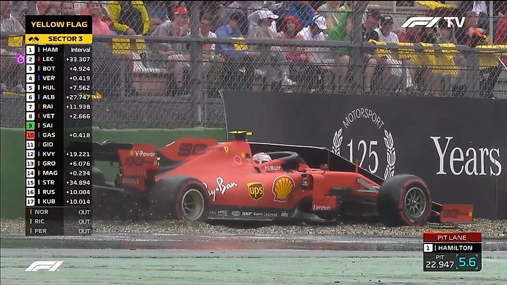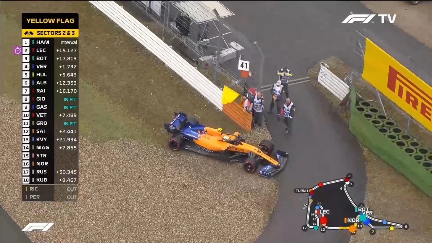 На трассе снова пошел дождь. Шарль Леклер вылетает в предпоследнем повороте и зарывается в гравий. Снова на трассе появляется машина безопасности. Практически сразу за Леклером, в том же повороте Льюис Хэмилтон ломает переднее антикрыло, после чего заезжает в боксы используя не правильную траекторию, но если в прошлом году Льюис не получил штраф за подобный инцидент, то в этом году судьи дали 5 секундный штраф. В боксах Льюис пробыл почти минуту, потому что механики были не готовы к пит-стопу.