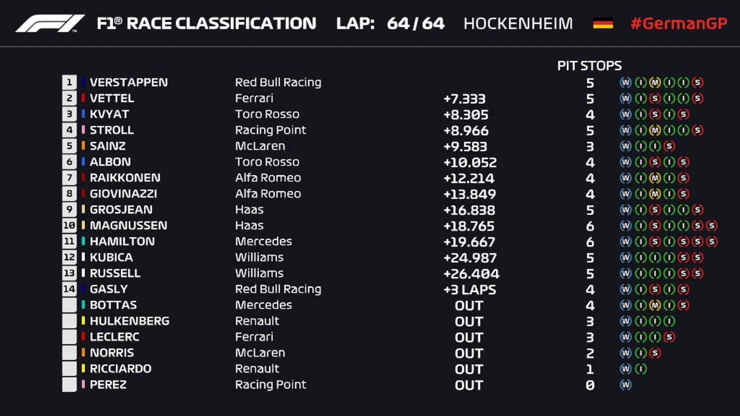 Себастьян Феттель за несколько кругов до финиша успел пройти и Лэнса Стролла и Даниила Квята. Но если канадец после обгона потерял подиум, то россиянин смог удержать 3 место в гонке.