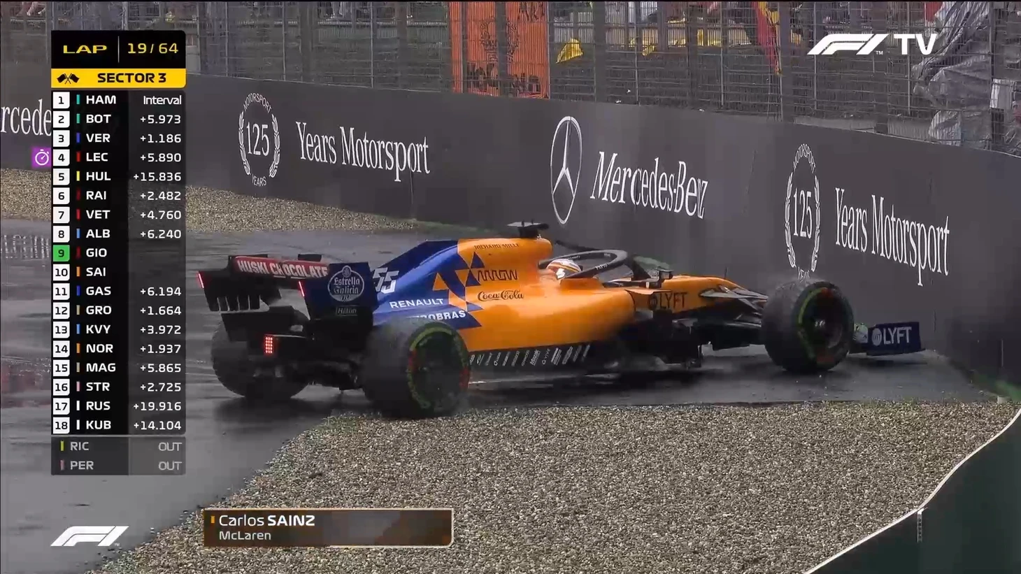 Спустя 3 круга Карлос Сайнц совершил ошибку в предпоследнем повороте (который доставил проблемы практически всем пилотам). Однако он смог вернуться и продолжить борьбу.