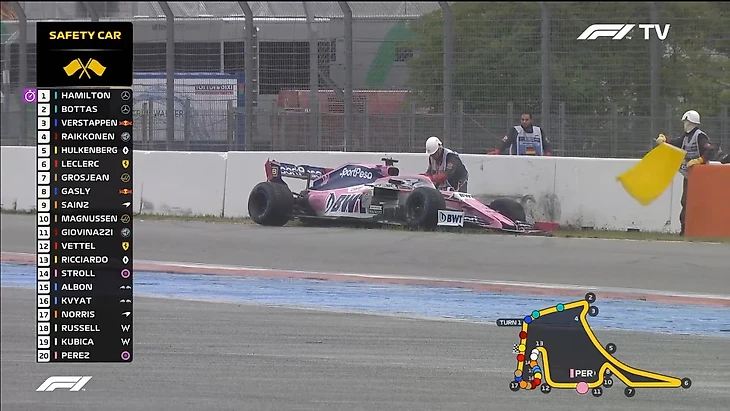 В самом начале Перес (Racing point) разбил болид чем вызвал появление машины безопасности. Многие пилоты реши перейти на промежуточную резину.