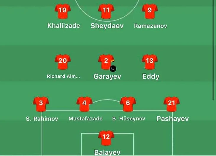 Герой матча с хорватами Тамкин Халилзаде на сей раз вышел в основе, на более удобной для позиции позиции вингера (в "Сабахе" он используется как защитник). Справа от Шейдаева расположился Агабала Рамазанов - юркий вингер отменно выступающий за "Сабаил". В средней линии стоит отметить возвращение после определенного перерыва Эдди Исрафилова, выступающего в испанской Сегунде. Дисквалифицированного Максима Медведева справа в обороне сменил выступающий за "Александрию" Павел Пашаев, а центр обороны сформировали Бадави Гусейнов ("Карабах") и находящийся в отменной форме Бахлул Мустафазаде ("Сабах").