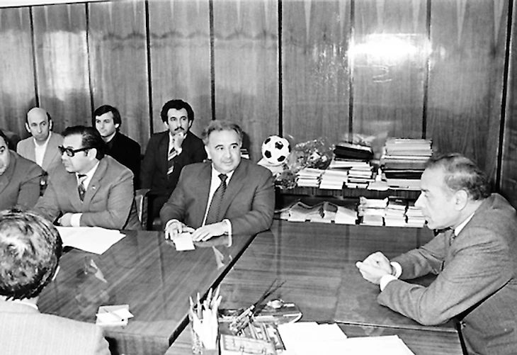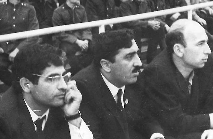 1966-й год, домашняя игра "Нефтяника". Старший тренер Ахмед Алескеров, начальник команды Шовкет Ордуханов, Борис Хетагуров