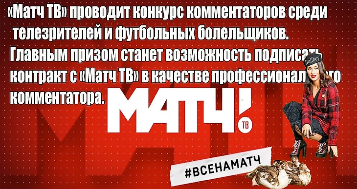 Каналу срочно требуются новые комментаторы, если ты любишь спорт, обладаешь хорошей дикцией и тебе есть, что сказать, отправляй свое резюме на сайт МатчТВ. Не упусти свой шанс подписать контракт с МатчТВ. Особое предпочтение уделяется кандидатам с ипотекой Все подробности конкурса на сайте МатчТВ.