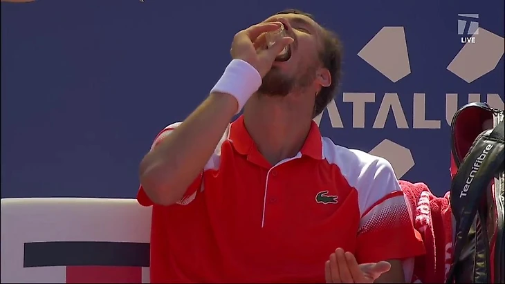 Медведев еще выйдет в финал Барселоны-500, но в финале проиграет Доминику Тиму. Там Даниил играл еще и в другом комплекте - синее поло сменилось на ярко-оранжевое. Эта форма запомнилась еще и благодаря видео, где теннисист справляется с судорогами с помощью соли.